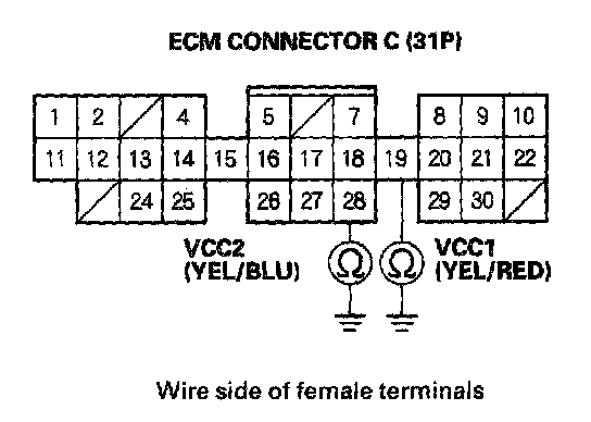 12. Disconnect the 3P connector from each of these sensors, one at a time, and check for continuity between body ground and ECM connector terminal C19 and C28 individually.