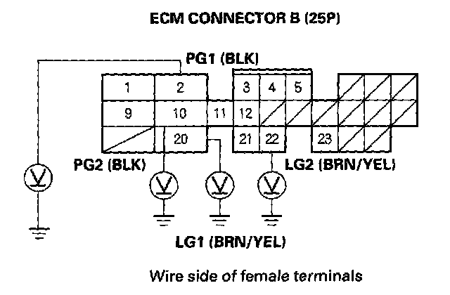 19. Measure voltage between body ground and ECM connector terminals B2, B10, B20, and B22 individually.