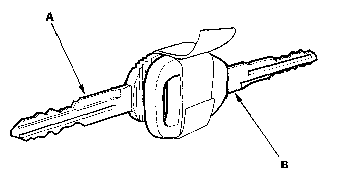 7. Tape the donor vehicle's ignition key head-to-head to the test vehicle's temporary key (A). The ECM will recognize the code from the donor vehicle's key (B) and allow you to start the engine with the temporary key.