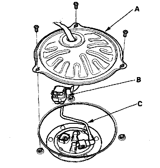 8. Remove the strainer case (A), the fuel gauge sending unit (B), and the wire harness (C).