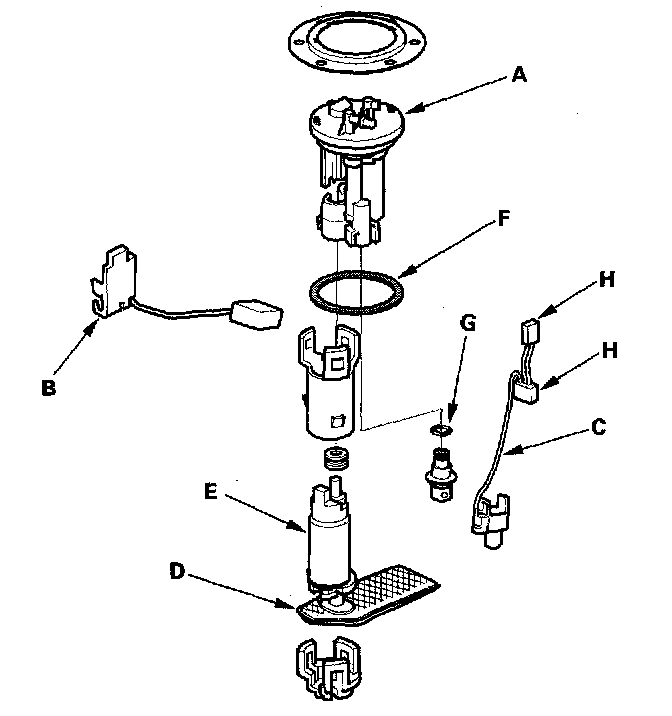 9. Remove the fuel filter (B), the fuel gauge sending unit (C), the case (D), the wire harness (E), and the fuel pressure regulator (F).