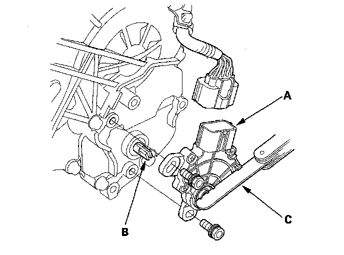 8. Install the transmission range switch (A) gently on the selector control shaft (B) with holding it in the N position with the 2.0 mm (0.08 inch) blade (C).