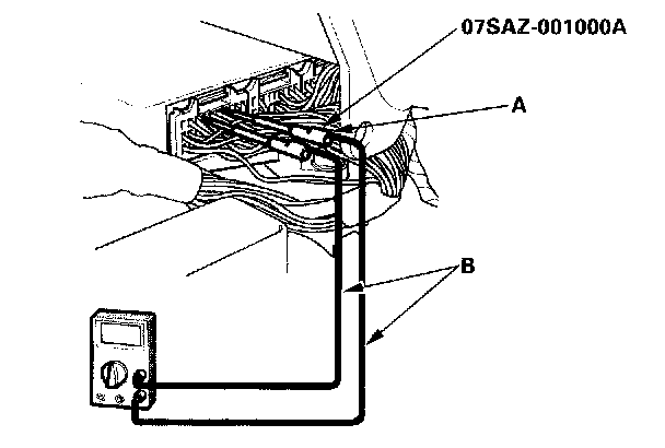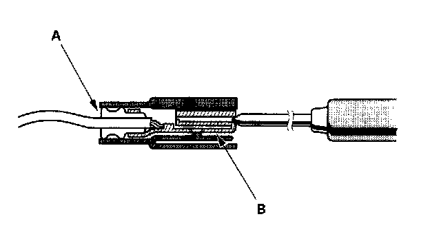 3. If you cannot get to the wire side of the connector or the wire side is sealed (A), disconnect the connector, and probe the terminals (B) from the terminal side. Do not force the probe into the connector.