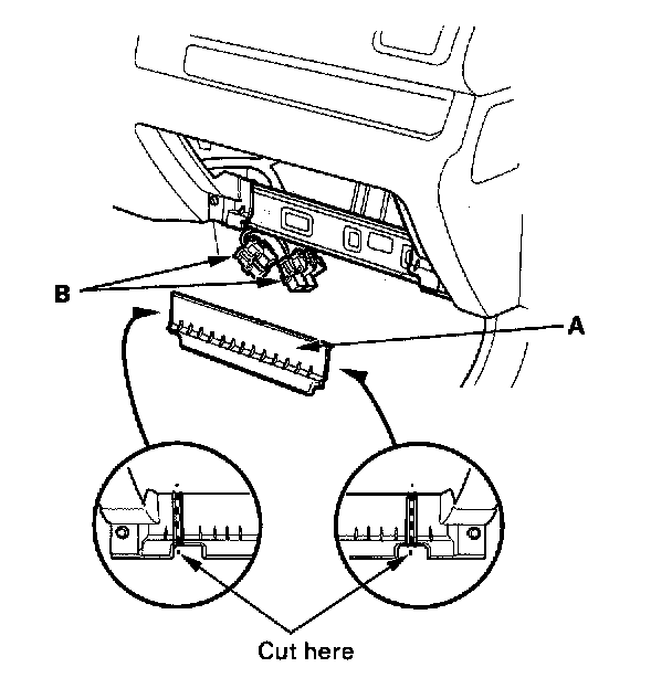 3. Cut the plastic cross brace in the glove box opening with diagonal cutters in the area shown. Remove and discard the plastic cross brace (A).