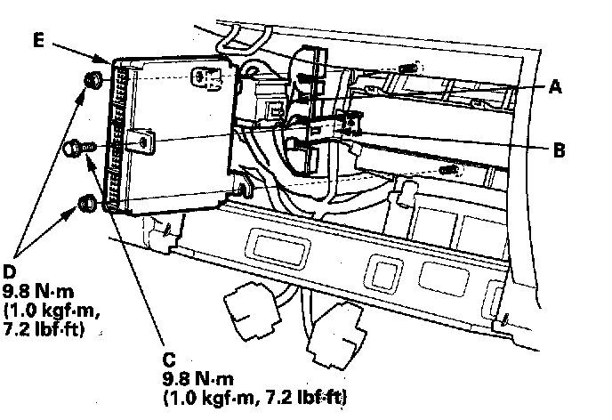 6. Remove the nuts (D), then remove the ECM/PCM (E).