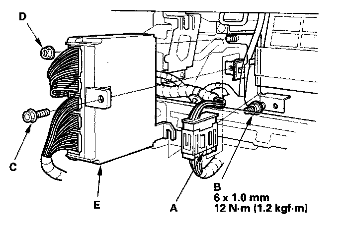 8. Lift the PCM up to clear the mounting nut on the lower right of the PCM, and pull out the PCM (E).
