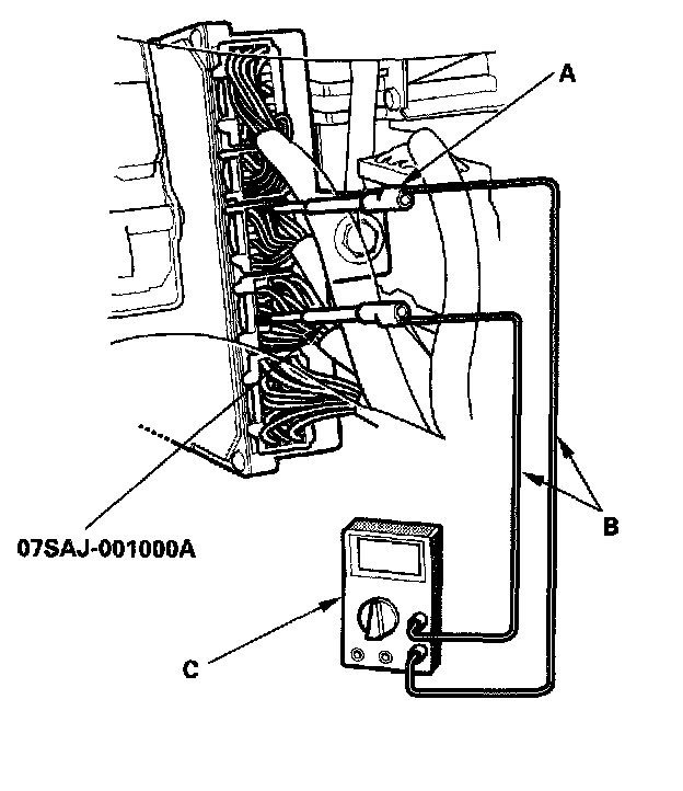1. Connect the backprobe adapters (A) to the stacking patch cords (B), and connect the cords to a digital multimeter (C).