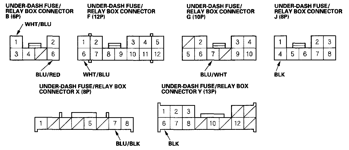 3. Disconnect the under-dash fuse/relay box connectors B, F, G, J, X and Y.