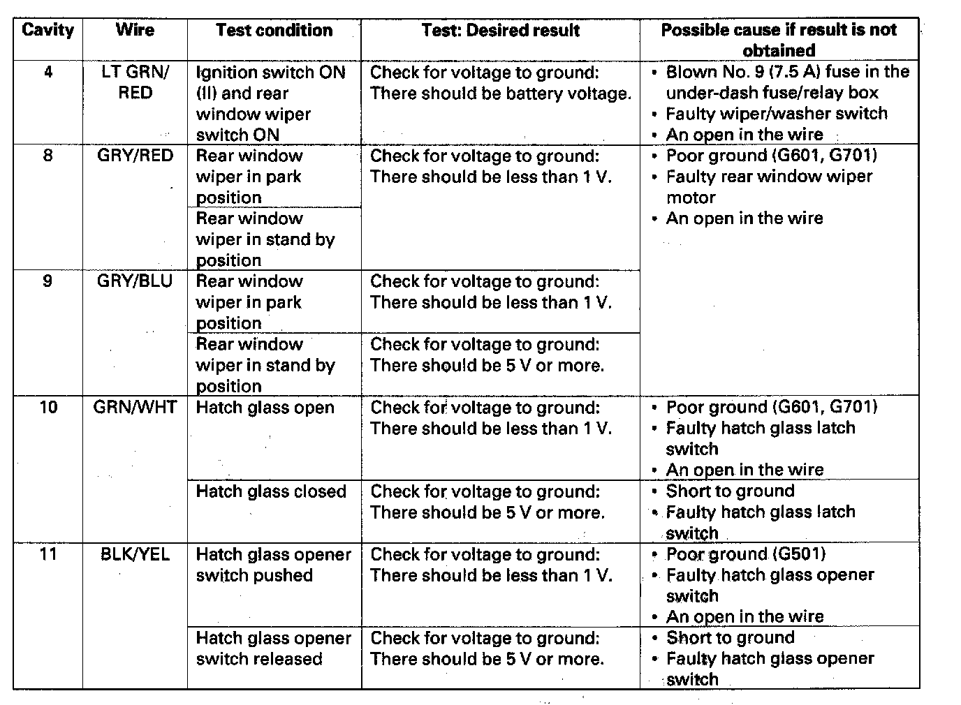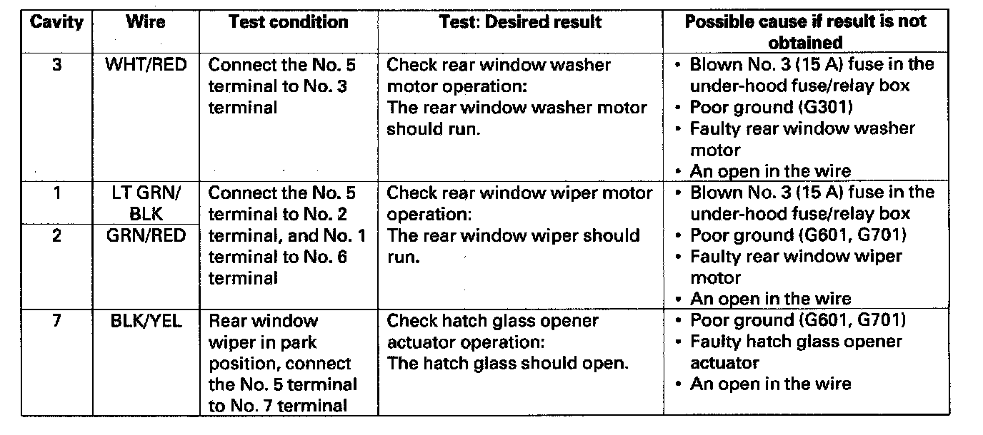 Home >> Honda >> 2005 >> CR-V 2WD L4-2.4L >> Repair and Diagnosis >> Wiper and Washer Systems >> Wiper Control Module >> Testing and Inspection >> Rear Window Wiper Control Unit Input Test