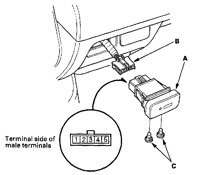 2. Check for continuity between the terminals in each switch position according to the table. If there is no continuity, replace illumination bulbs (C) or the switch.