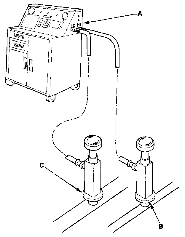 1. Connect an R-134a refrigerant recovery/recycling/charging station (A) to the high-pressure service port (B) and the low-pressure service port (C), as shown, following the equipment manufacturer's instructions.