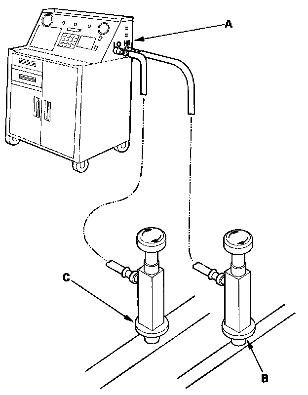 1. Connect an R-134a refrigerant recovery/recycling/charging station (A) to the high-pressure service port (B) and the low-pressure service port (C), as shown, following the equipment manufacturer's instructions.