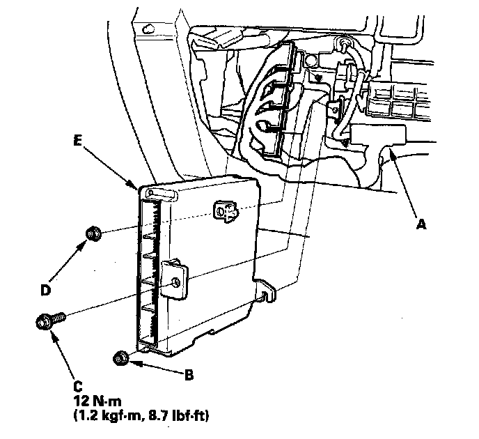 9. Lift the PCM up to clear the mounting nut on the lower right of the PCM, then pull out the PCM (E).