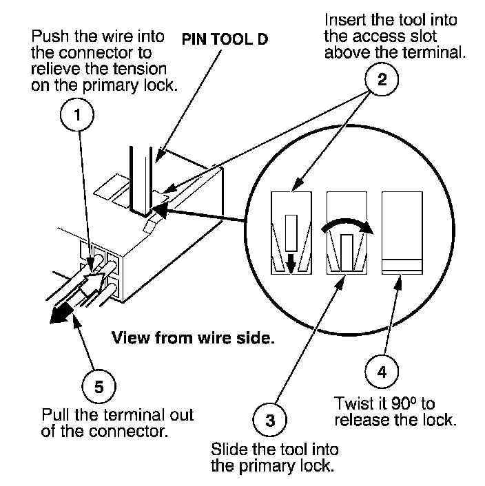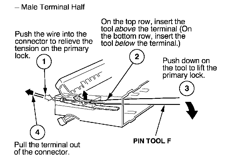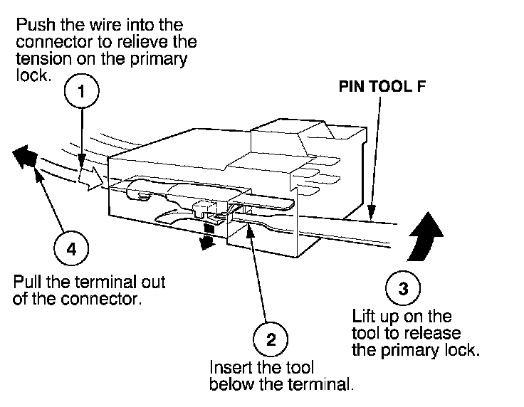 Before you begin, inspect the wire you are about to repair for damage and length. Make sure the wire will be long enough to make a terminal repair without stretching it when you reinstall the terminal in the connector. If the wire is too short, or if access to the connector is too restricted to make a terminal repair, you may need to install a pigtail terminal (a short length of wire with a factory-crimped terminal on it). Refer to HOW TO INSTALL PIGTAIL TERMINALS.