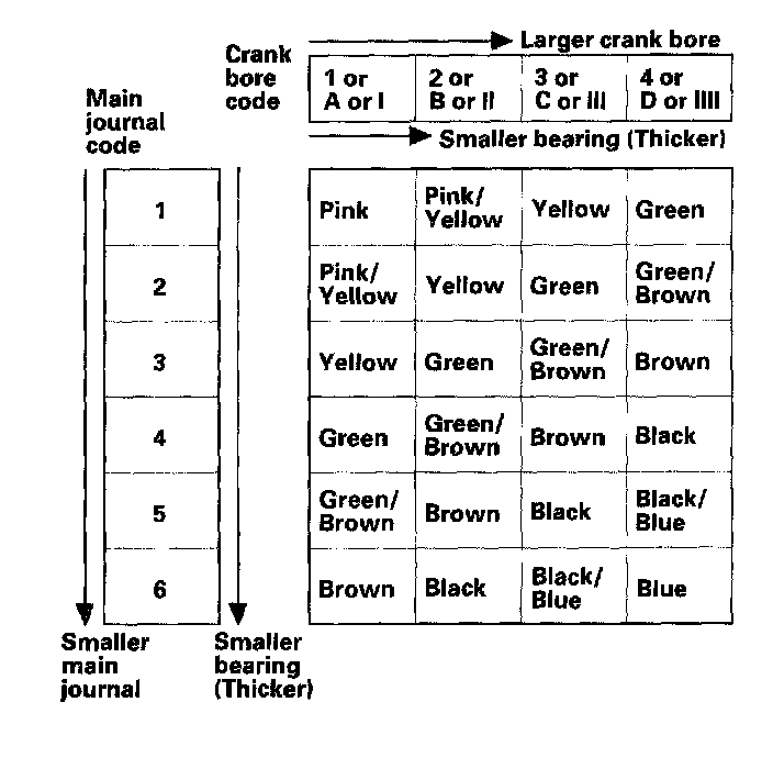 3. Use the crank bore codes and crank journal codes to select the appropriate replacement bearings from the table.