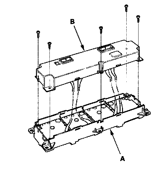 2. Remove the self-tapping screws, then carefully separate the A/C control panel display (A) from the control panel (B). Do not kink or pull on the wires between the display and the control panel. Do not touch the electronic components on the printed circuit board in the control panel.