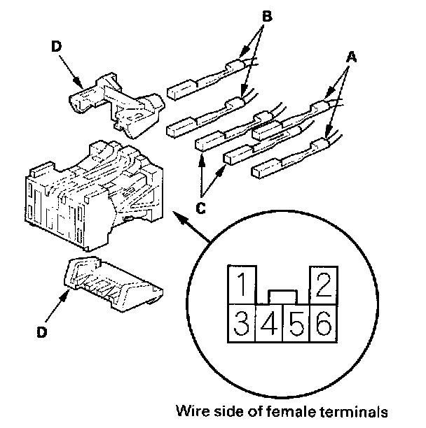 5. Remove the terminal (C) from the connector by pushing the lock tab (D) in the connector using a thin blade screwdriver (E). Remove all six terminals, and replace the connector.