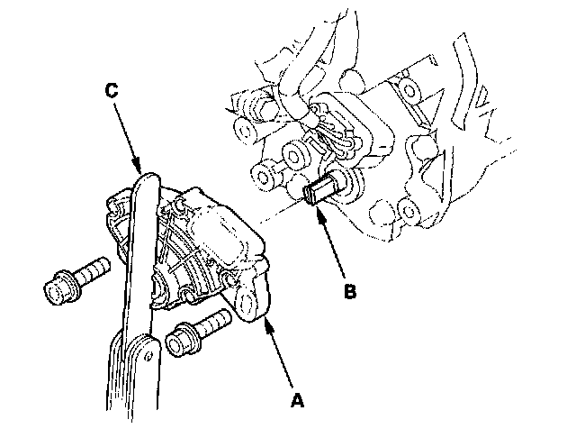 7. Align the cutouts (A) on the rotary-frame with the neutral positioning cutouts (B) on the transmission range switch (C), then put a 2.0 mm (0.08 inch) feeler gauge blade (D) in the cutouts to hold the switch in the N position.