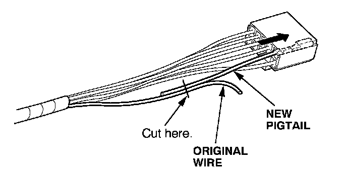 6. Lay the pigtail and the original wire side-by-side, and cut off both ends at once. If you are making more than one splice, do not cut each pigtail at the same location; the resulting "lump" of splice connectors would interfere with rewrapping the harness. Instead, cut the first pigtail close enough to the terminal so you will have room to make each remaining cut about 20 mm (3/4 inch) farther down on the next pigtail.