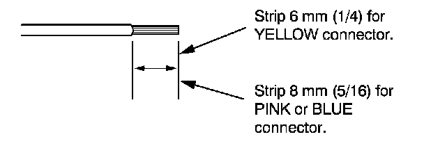7. If you are using a yellow splice connector, strip about 6 mm (1/4 inch) of insulation off the ends of both wires. If you are using a pink or blue splice connector, strip off about 8 mm (5/16 inch) of insulation.