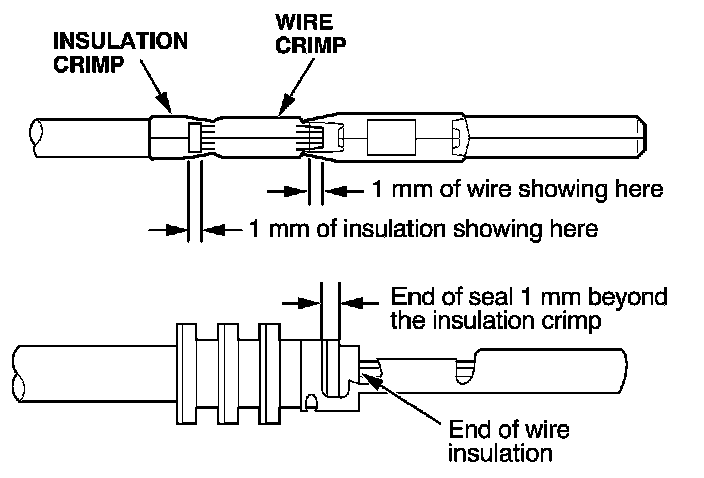 3. Strip the insulation off the end of the wire so the wire fits in the new terminal as shown. (If the wire has a wire seal, replace it with a new one from the kit.)