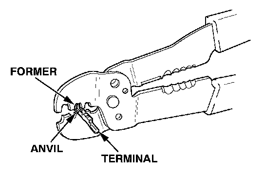 4. Position the terminal in the crimping tool slot with the solid portion of the terminal toward the anvil and the open section toward the former.