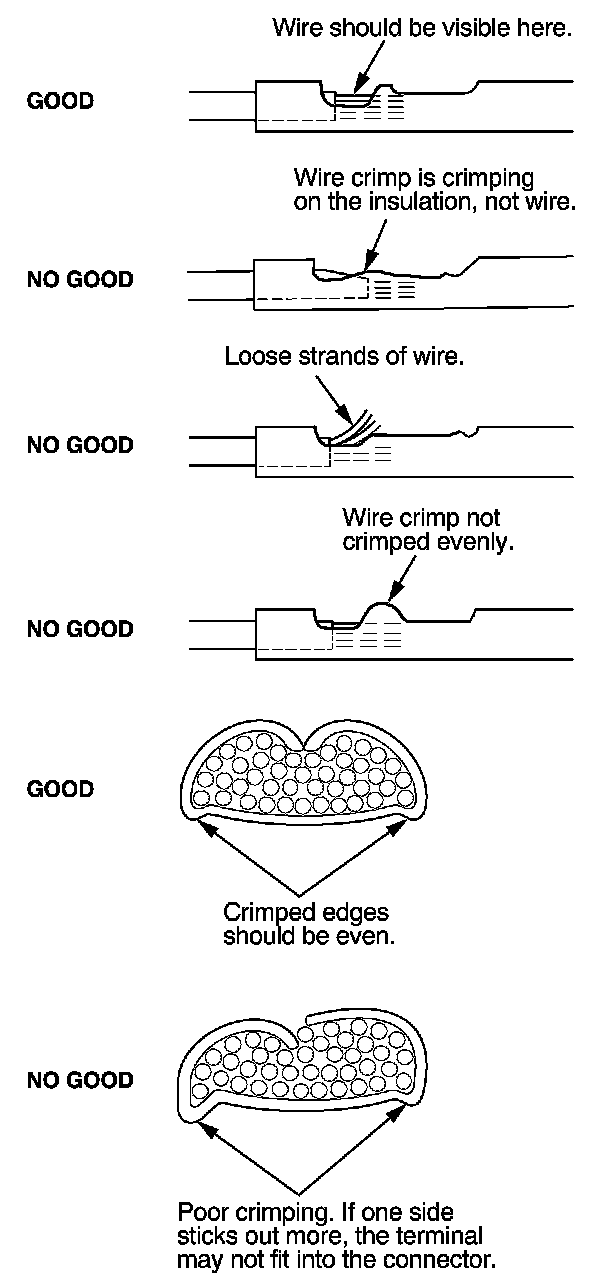 8. Inspect the quality of the wire crimp. If it has any of the mentioned NO GOOD crimps, cut it off and start over.