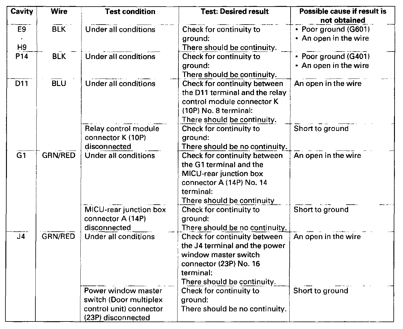 Multiplex Integrated Control Unit Input TestNOTE: Make sure the ignition switch is OFF before troubleshooting the driver's under-dash fuse/relay box connectors.