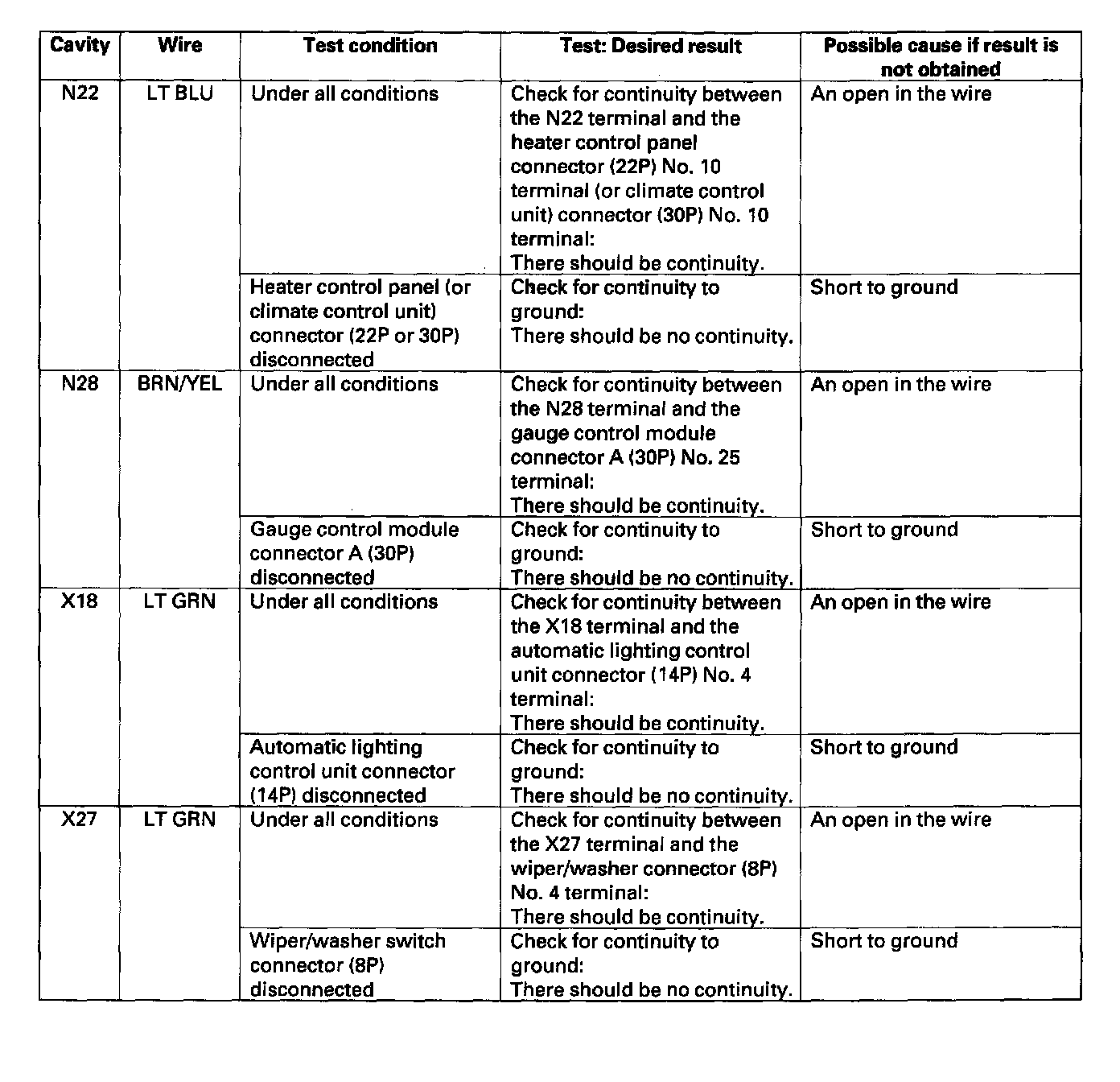 5. Reconnect the connectors to the driver's under-dash fuse/relay box, and make sure these input tests at the appropriate connectors on the driver's under-dash fuse/relay box.