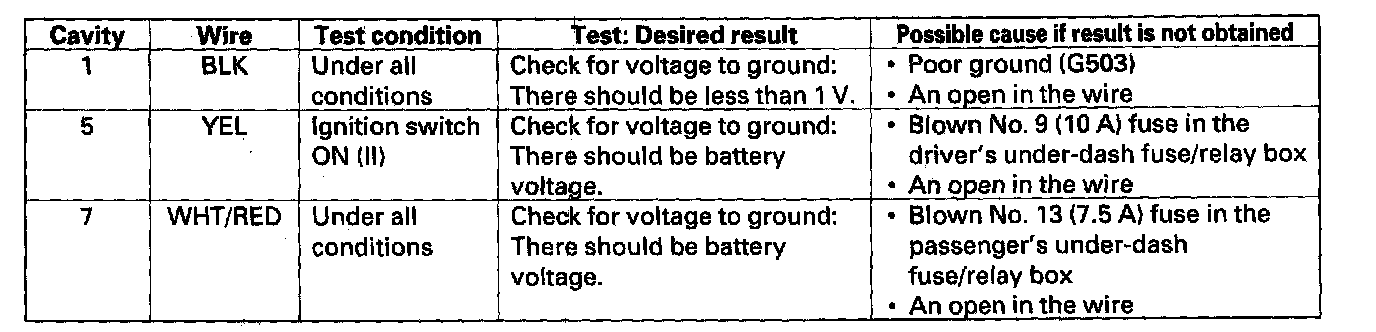 4. Reconnect the connector to the control unit, and make these input tests at the connector.