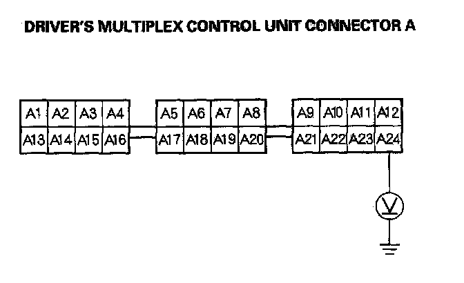 8. Check for voltage between the A24 terminal of the driver's under-dash fuse/relay box socket and body ground.