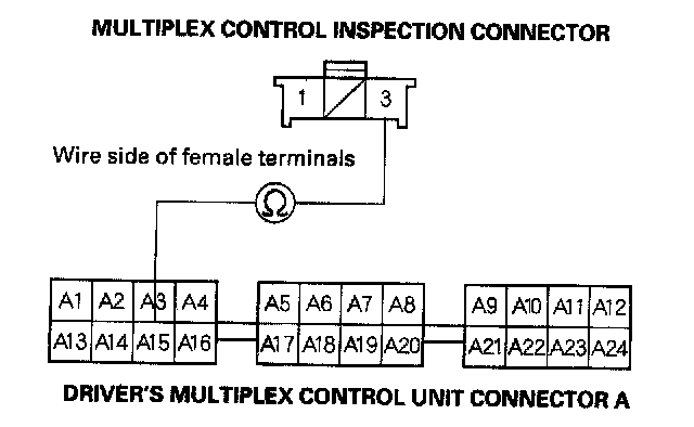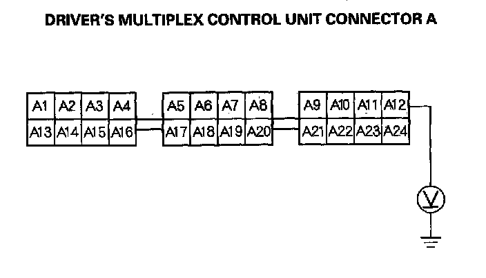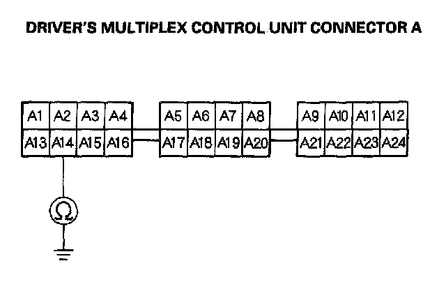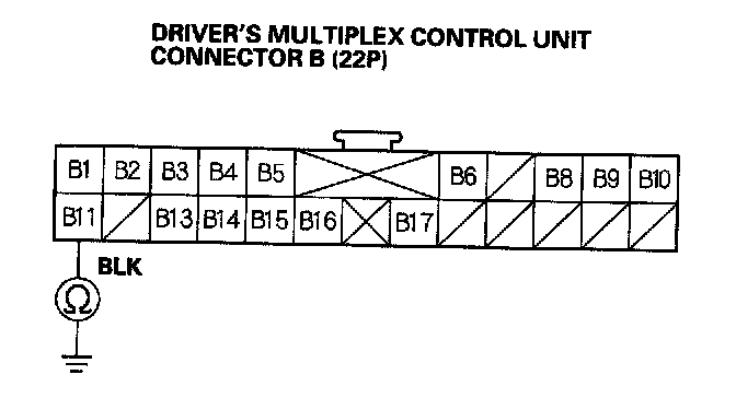 12. Check for continuity between the B11 terminal of the driver's multiplex control unit connector and body ground.