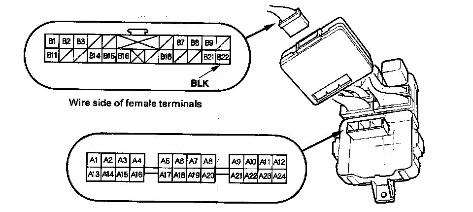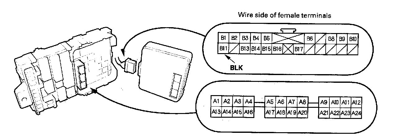 10. Make the following input tests at 22P connector B and the driver's under-dash fuse/relay box socket connector A. Be careful not to spread the fuse box connectors.