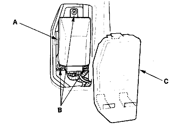 1. Place the new OPDS unit (A) on the seat-back frame. Tighten the three screws (B), and connect the OPDS harness 8P connector D and sensor connectors to the OPDS unit. Reinstall the cover (C).