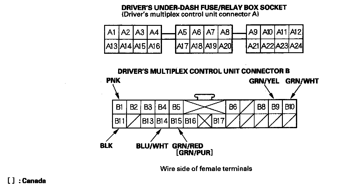 4. With the driver's multiplex control unit still disconnected, make these input tests at the connector and driver's under-dash fuse/relay box sockets.
