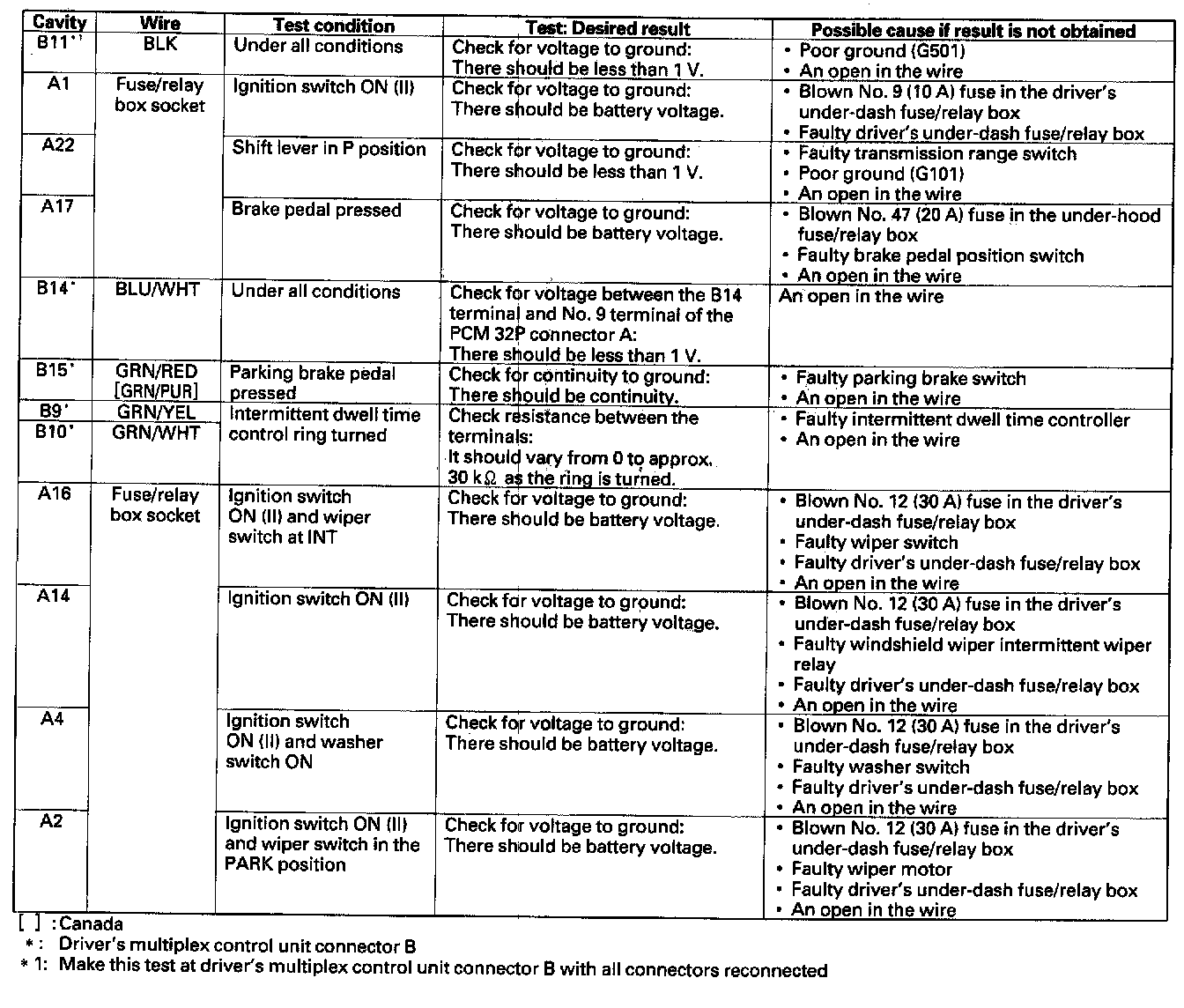 1. Before testing the wiper/washer control functions, troubleshoot the multiplex control system. Multiplex Control Unit Input Test