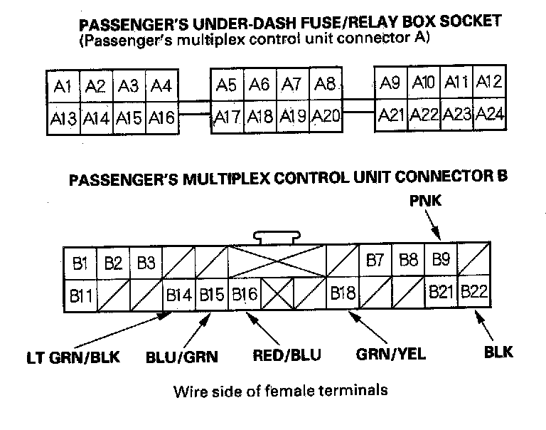 4. With the passenger's multiplex control unit still disconnected, make these input tests at the connector and passenger's under-dash fuse/relay box sockets.
