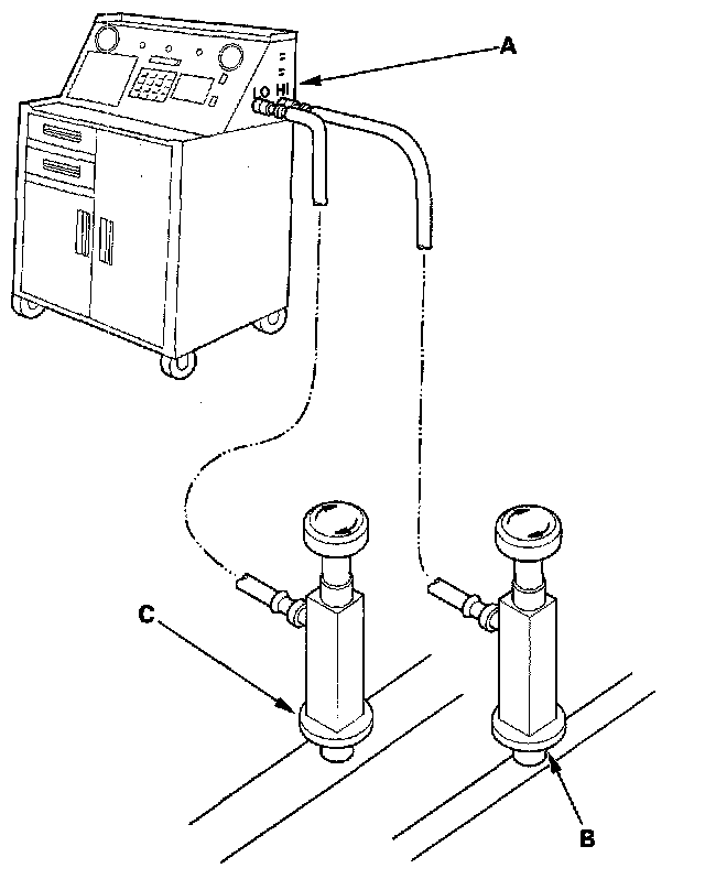1. Connect a R-134a refrigerant recovery/recycling/charging station (A) to the high-pressure service port (B) and the low-pressure service port (C), as shown, following the equipment manufacturer's instructions.