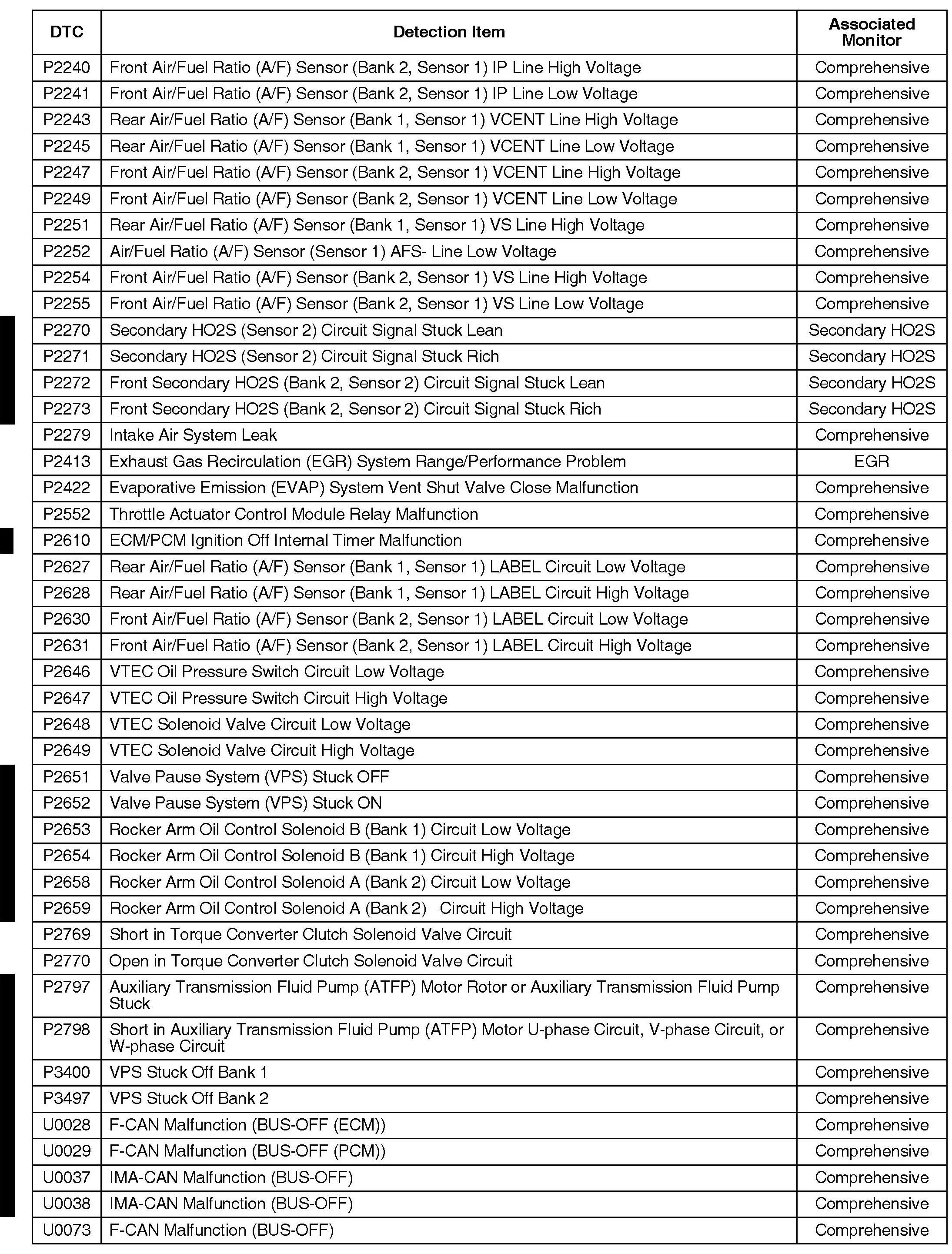 Following is a list of all OBD II DTCs and their associated monitors for all Honda automobiles with OBD II. No one model has every DTC in the list.