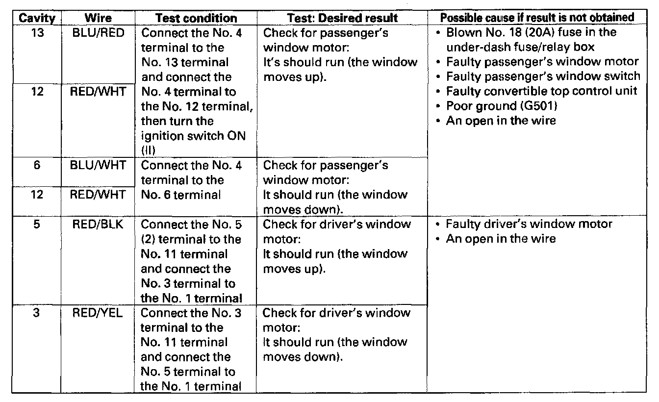 5. Reconnect the power window master switch, and perform the following input tests at the 14P connector.