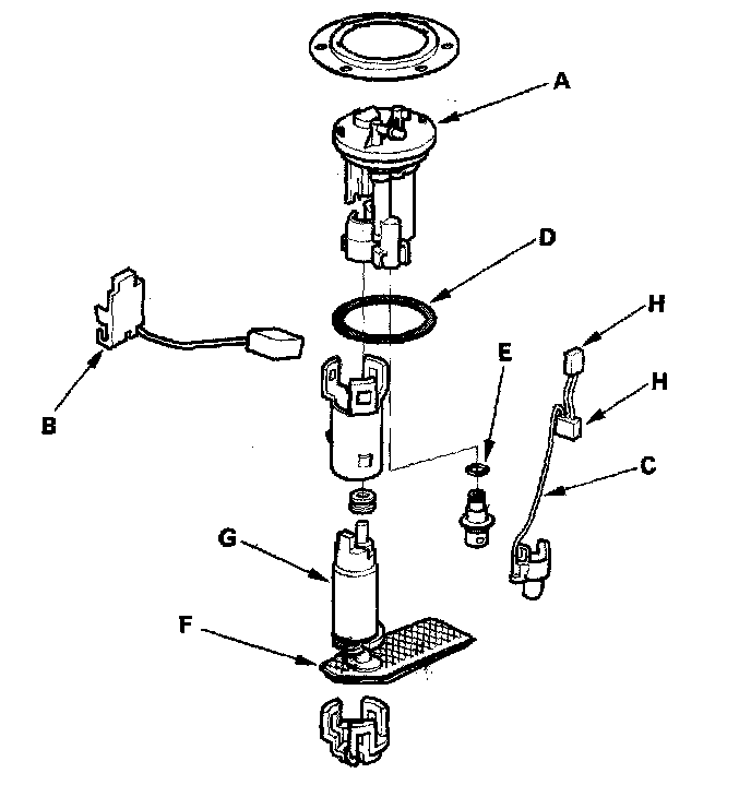 9. Remove the fuel filter (B), the fuel gauge sending unit (C), the case (D), the wire harness (E), and the fuel pressure regulator (F).