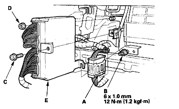 7. Lift the PCM up to clear the mounting nut on the lower right of the PCM, and pull out the PCM (E).