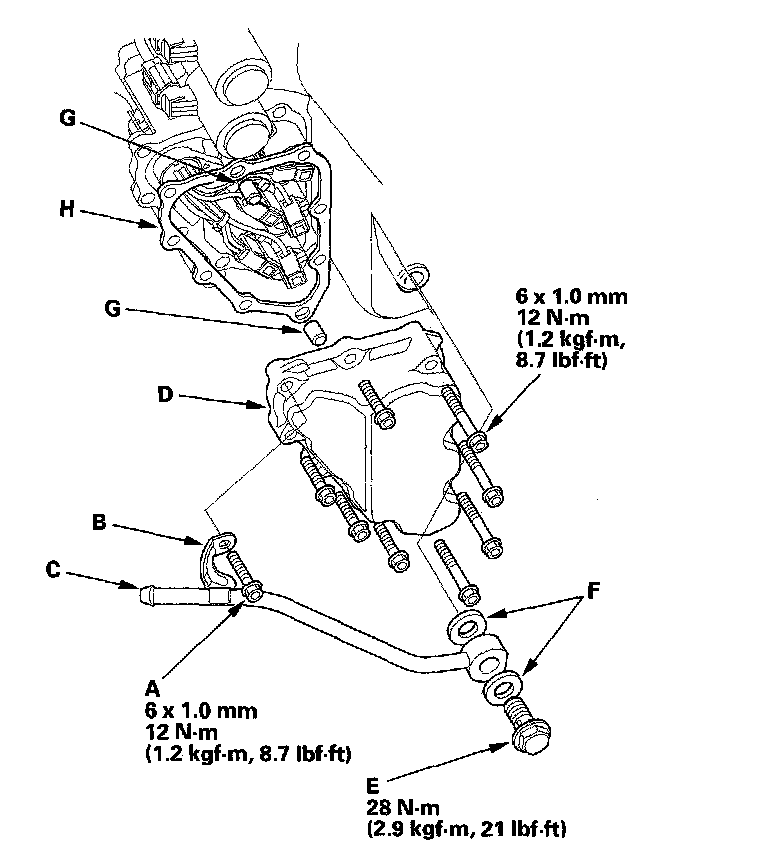 9. Remove the bolt (A) securing the bracket (B) of the ATF cooler inlet line (C) on the shift solenoid valve cover (D), and remove the line bolt (E) and sealing washers (F).