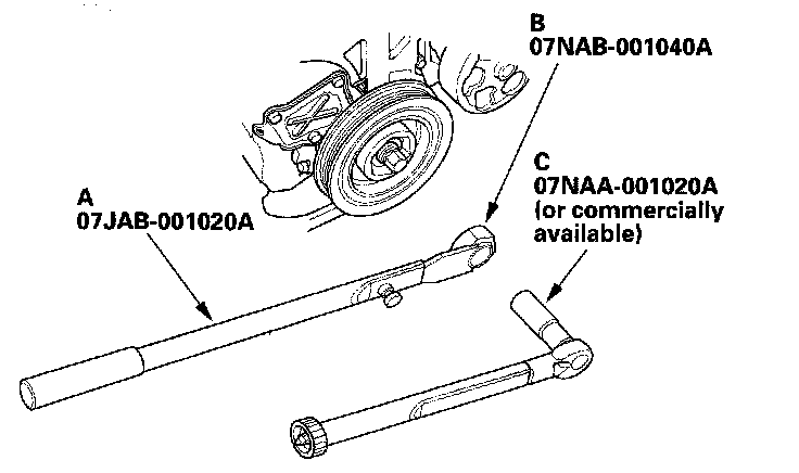 Tighten the bolt to 50 Nm (5.0 kgf-m, 36 ft. lbs.) with a torque wrench and 19 mm socket (C). Do not use an impact wrench.