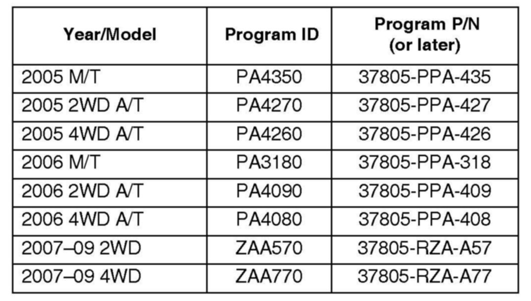 The updated PGM-FI software program IDs and P/Ns are shown above. If this, or a later program ID, is the Current Program ID displayed during the update, the software for this service bulletin is already installed.