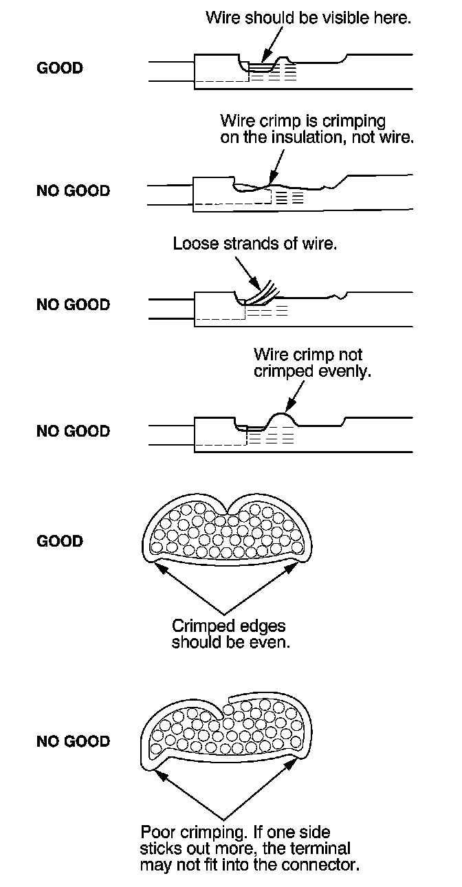 8. Inspect the quality of the wire crimp. If it has any of the following NO GOOD crimps, cut it off and start over.
