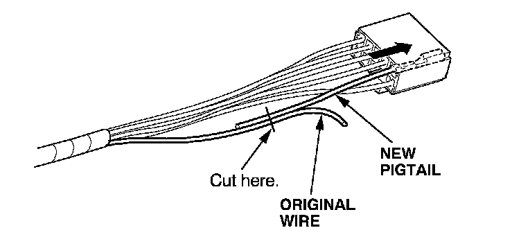 6. Lay the pigtail and the original wire side-by-side, and cut off both ends at once. If you are making more than one splice, do not cut each pigtail at the same location; the resulting lump of splice connectors would interfere with rewrapping the harness. Instead, cut the first pigtail close enough to the terminal so you will have room to make each remaining cut about 20 mm (3/4 inch) farther down on the next pigtail.