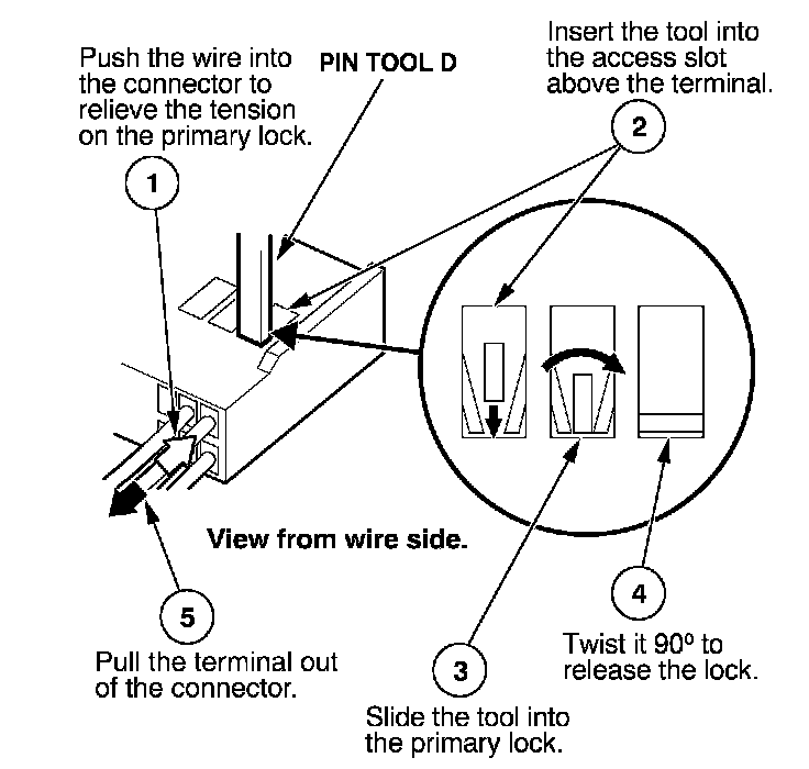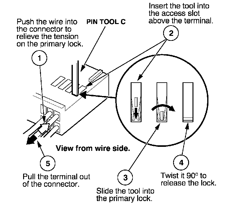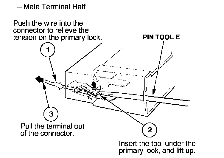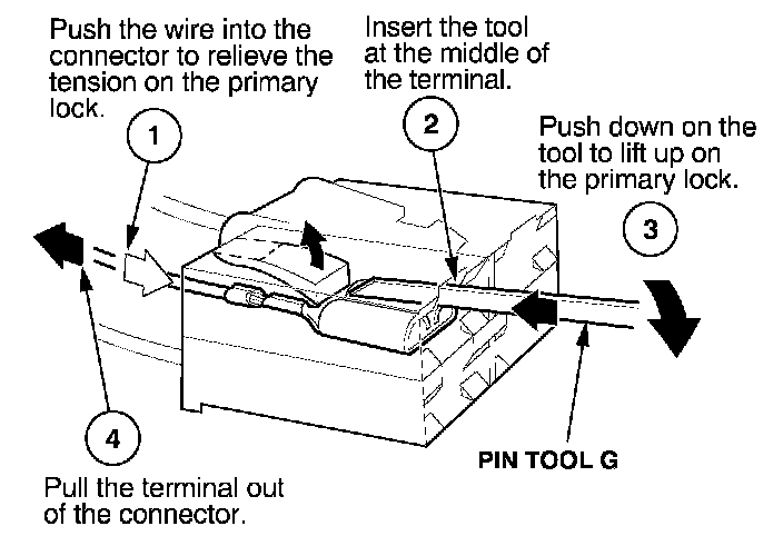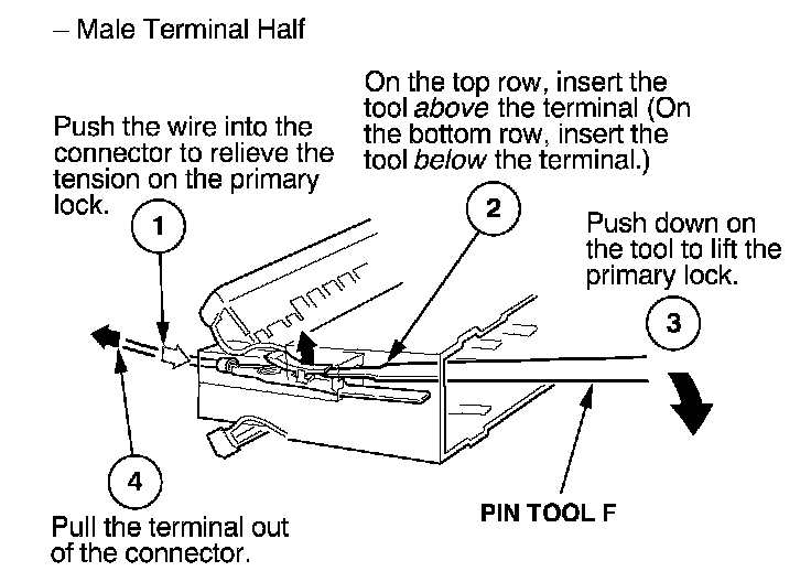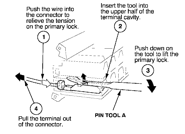 Before you begin, inspect the wire you are about to repair for damage and length. Make sure the wire will be long enough to make a terminal repair without stretching it when you reinstall the terminal in the connector. If the wire is too short, or if access to the connector is too restricted to make a terminal repair, you may need to install a pigtail terminal (a short length of wire with a factory-crimped terminal on it). Refer to HOW TO INSTALL PIGTAIL TERMINALS.