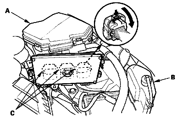 4. Remove the expansion tank (B). Disconnect the ECM connectors (C).