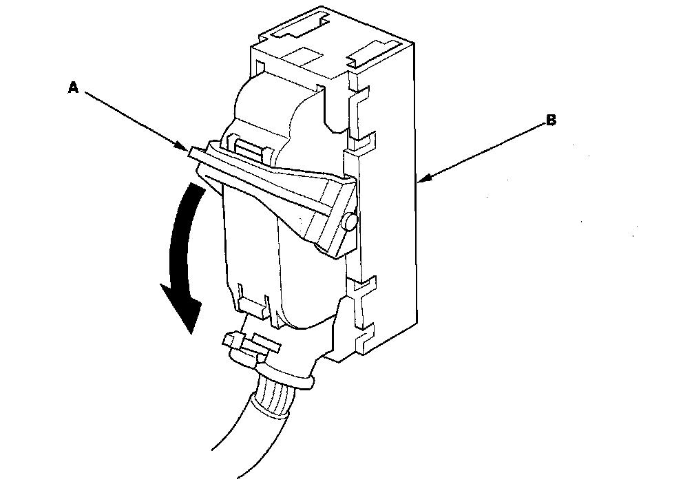 1. Push in the locking tab (A) and pull up the lock (B) of the ABS modulator-control unit 47P connector (C), and the connector disconnects itself.